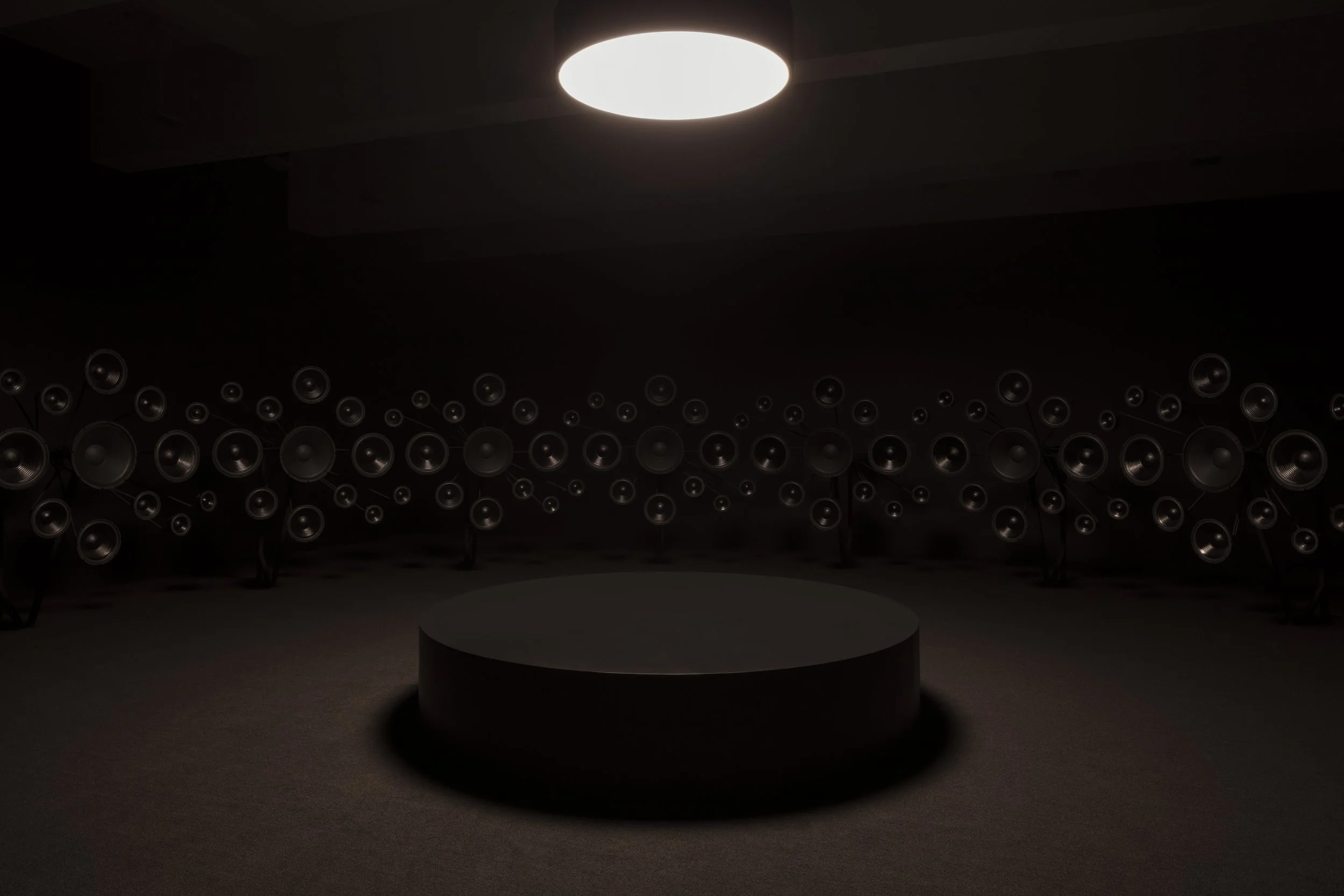 Jónsi, Silent sigh (dark),2023. Speakers, metal, electronics. 117 x 114 x 69 inches; 297.2 x 289.5 x 175.2 cm. Courtesy the artist and Tanya Bonakdar Gallery, New York / Los Angeles.