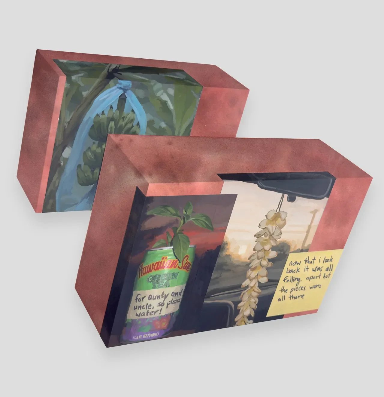 In BUT THE PIECES WERE ALL THERE (2025), acrylic wraps seamlessly across a large, shaped panel, its beveled edges operating as more than structural support — they become an activated perimeter. A hanging lei, a can label, a roadside horizon, and a handwritten note hover within a constructed depth that feels intimate yet architectural. The illusion of collage bends convincingly around the panel’s corners, but up close, the raw cotton surface, crisp paint edges, and subtle shifts in sheen reveal the work’s material precision.
