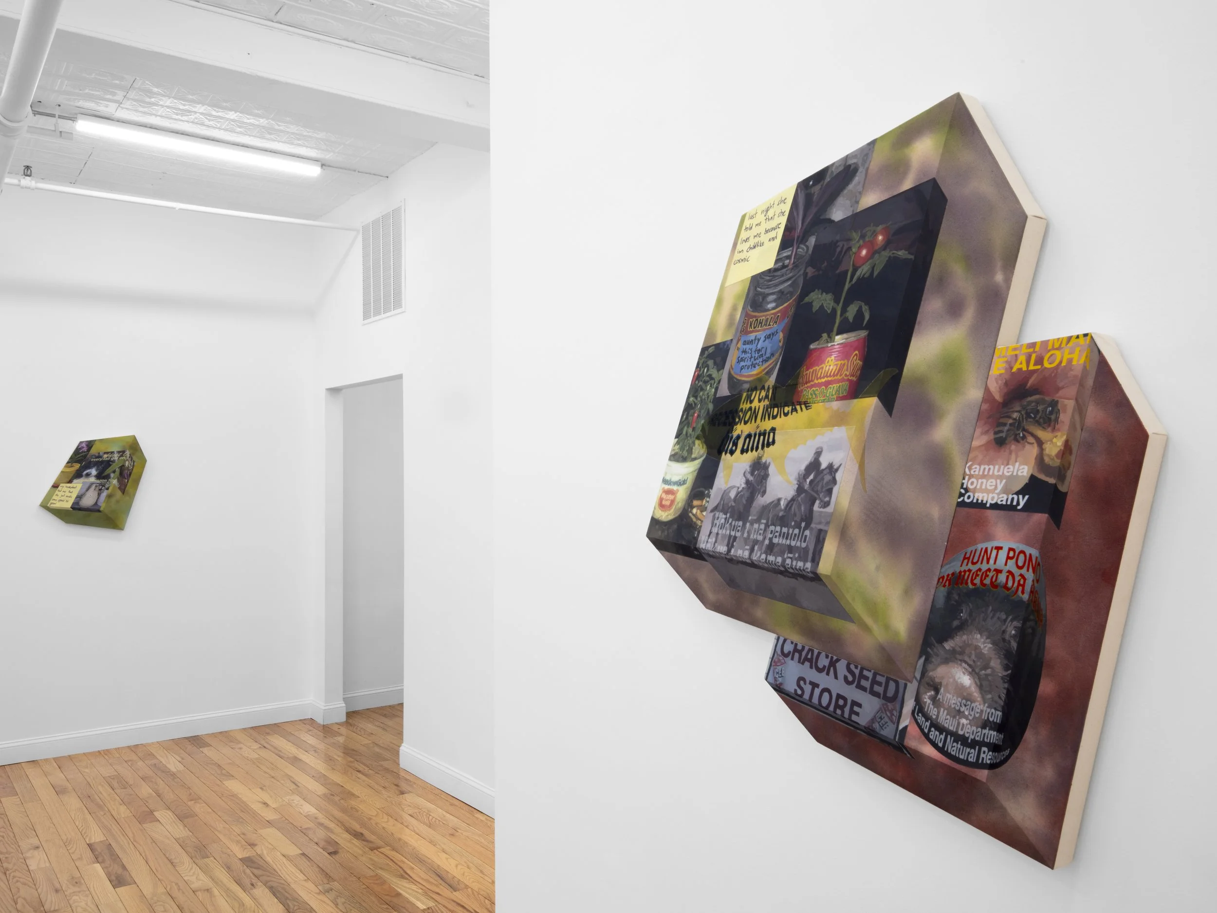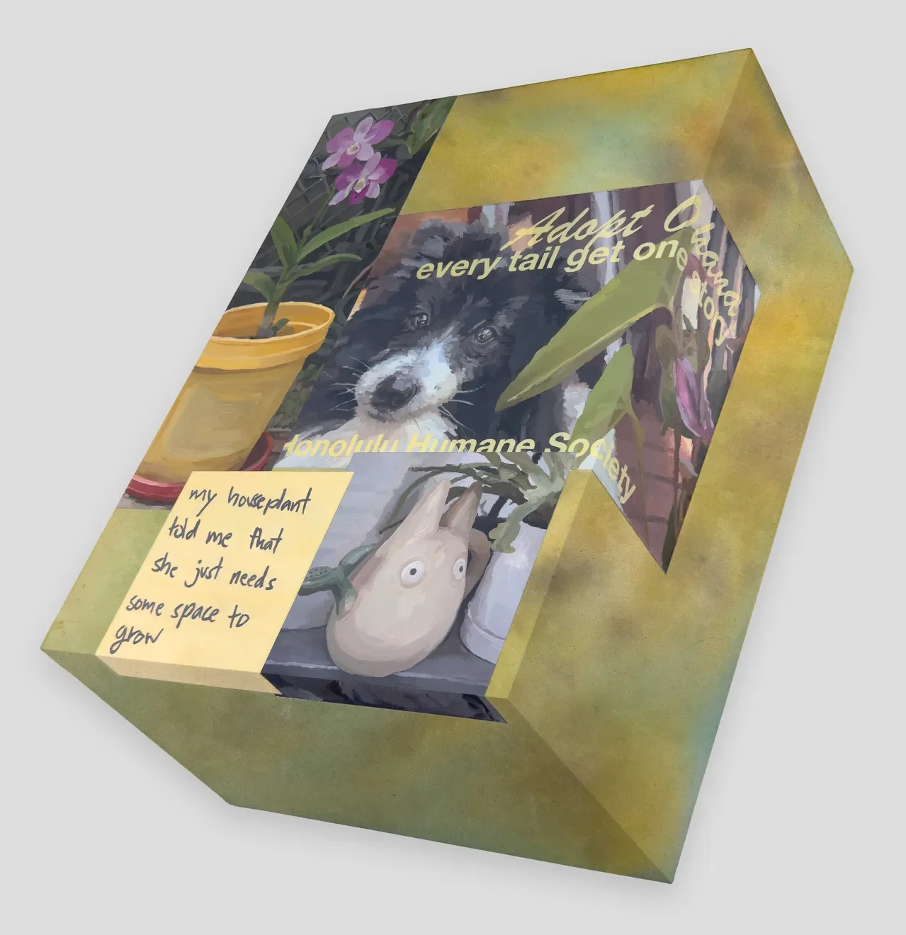 Rooted in the polyethnic, Creole culture of Hawai‘i, Ho approaches identity not as essence but as residue: inherited, partial, felt, and never fully claimed. Through shaped canvas panels that use trompe-l’oeil — a painting technique that creates the illusion of three-dimensional depth — archival fragments and handwritten text are layered into single, faceted surfaces that blur the boundary between painting and object. These spatially assertive forms project toward the viewer like bodies in conversation, their dyed raw-cotton surfaces accumulating phrases and images the way memory accumulates keepsakes.